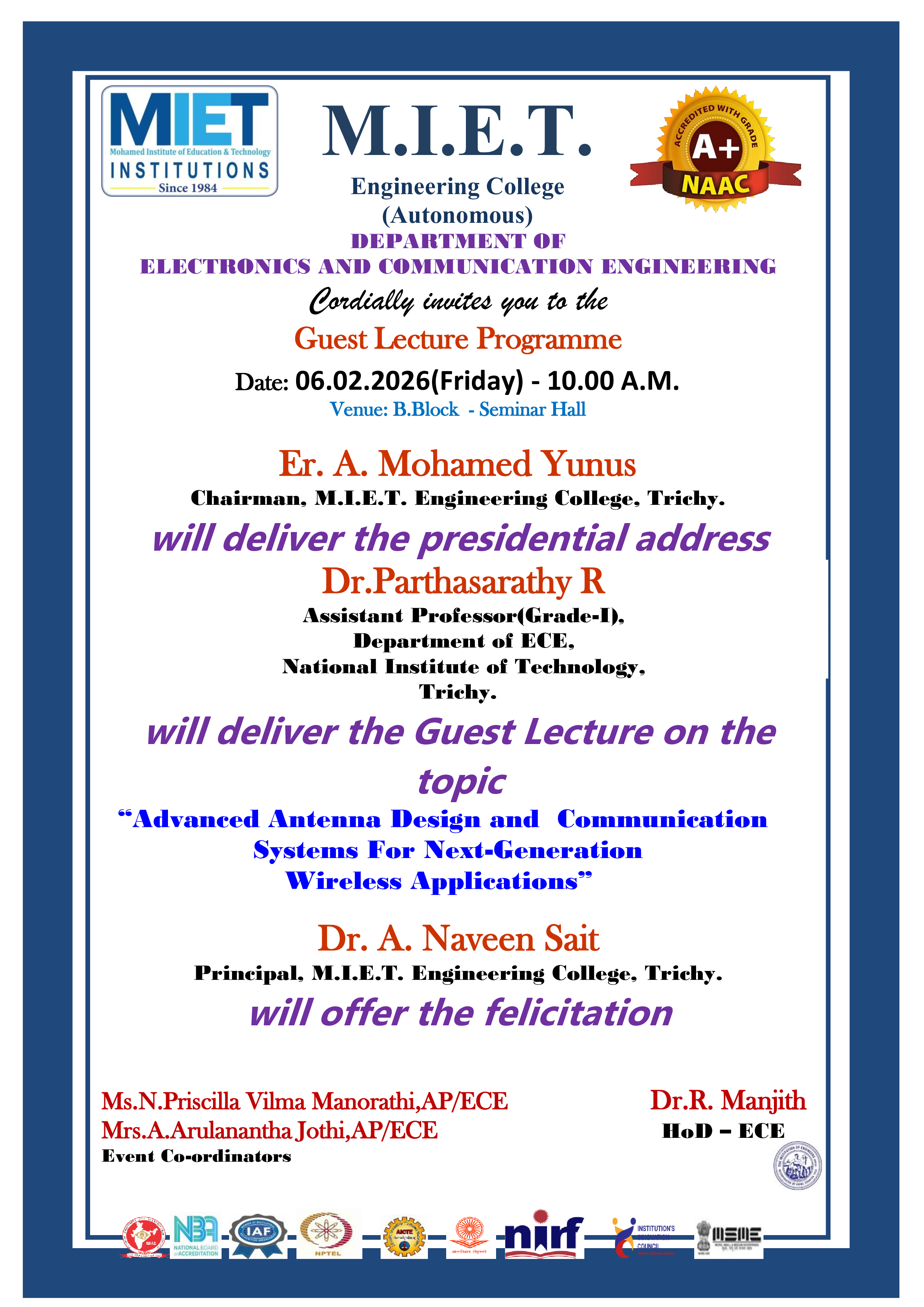 National Programme on Technology Enhanced Learning (NPTEL) is an initiative by 7 IITs and IISc for creating course contents in engineering and science with the basic objective to devise and guide reforms that will transform India into a strong and vibrant knowledge economy. M.I.E.T. Engineering College is established as the Local Chapter of IIT Madras for the NPTEL Courses from May, 2017.