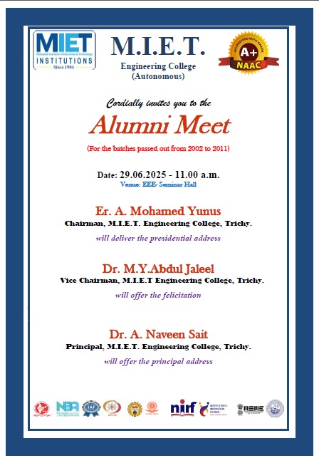 The M.I.E.T. Society, founded by Er. A. Mohamed Yunus during the year 1984, offers a high quality holistic education in an underdeveloped rural and semi-urban region of Tiruchirappalli, Tamil Nadu. The society’s members include leading Industrialists, Educationists and Philanthropists.